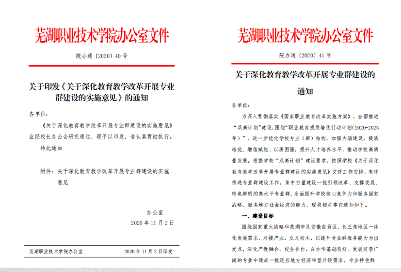 2020年,为加快安徽“双高计划”建设步伐,学校牵头举办安徽省首届“双高计划”专业群建设研讨会,深入研讨“双高计划”建设政策内涵,交流分享“双高计划”建设工作经验,共襄安徽高职教育高质量发展宏图,充分发挥我校“双高计划”建设的示范引领效应,带动全省职业教育内涵发展水平的整体提升。由我校牵头组建的安徽省双高专业群课程共享与应用平台正式启动运营,为推动省内高职院校课程资源的互动互联、共建共享奠定坚实的基础。