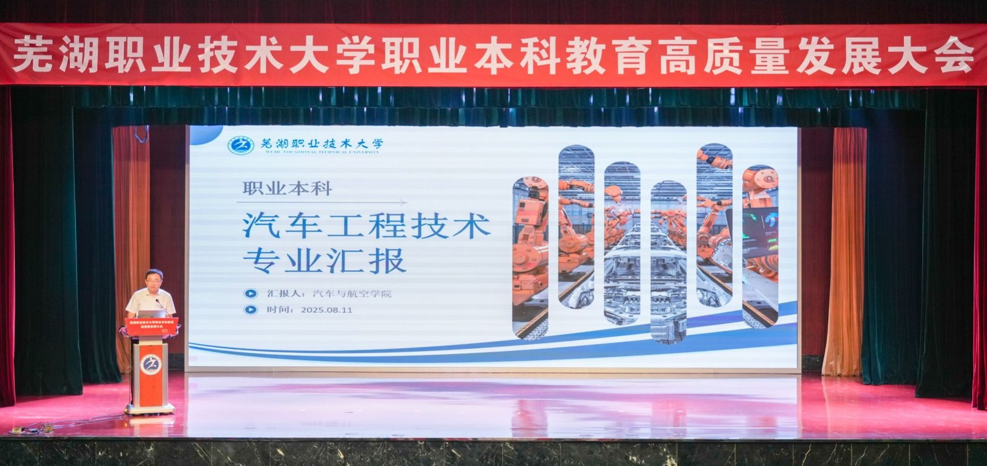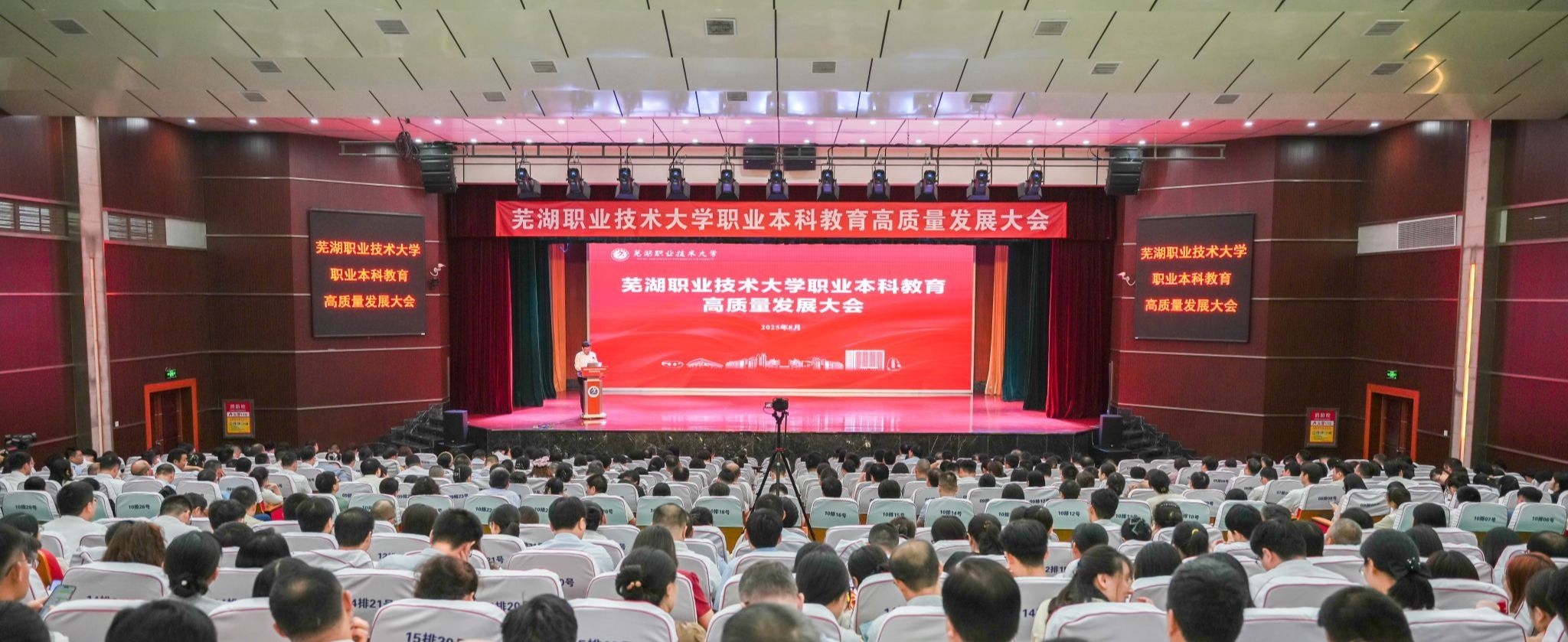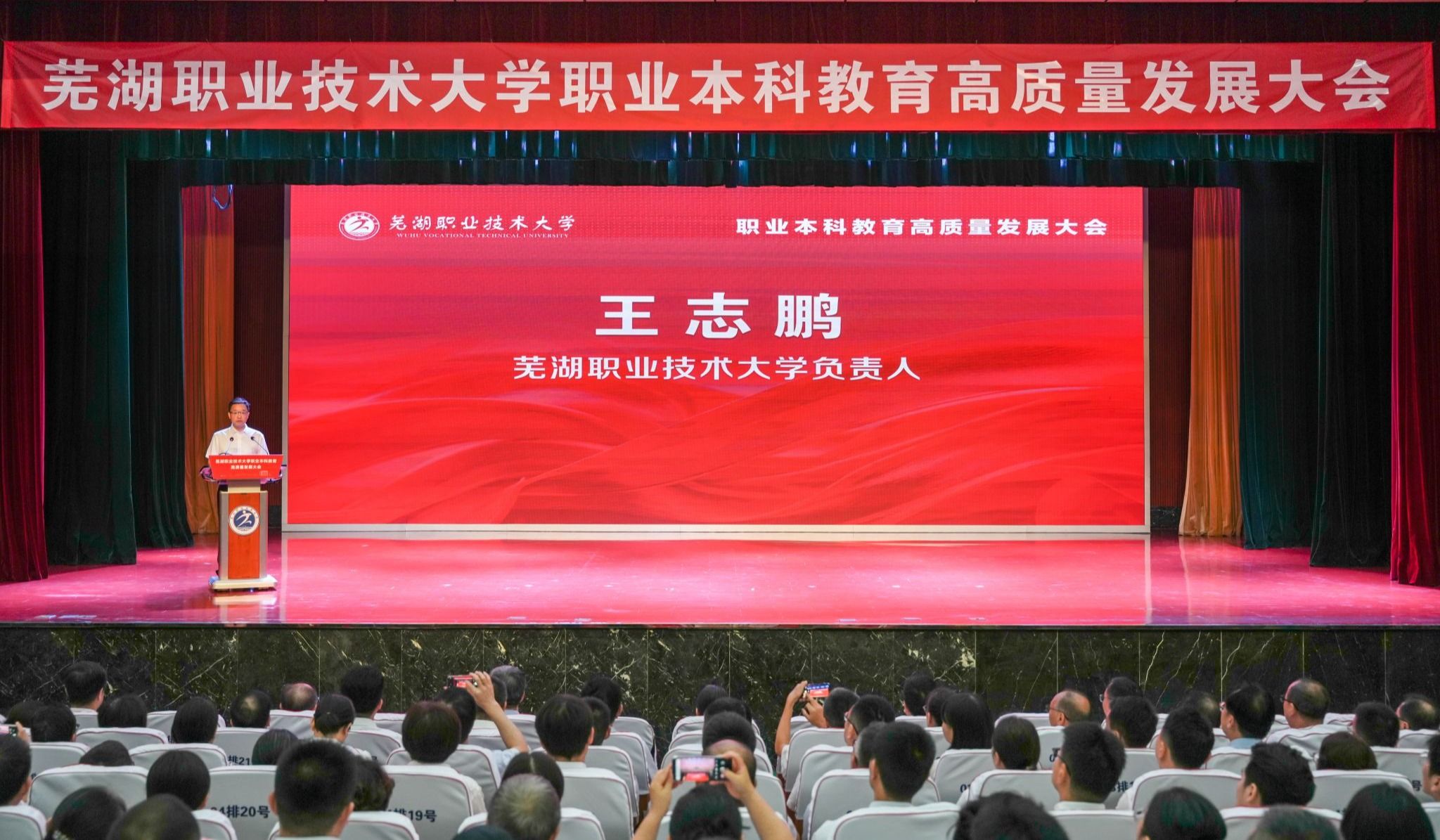 8月11日上午,芜湖职业技术大学职业本科教育高质量发展大会在文津校区大礼堂隆重召开。芜湖市委书记宁波出席并致辞。市人大常委会主任张峰,市政协主席张东,市有关部门负责同志参加。校党委书记王志鹏等党政班子成员,部分退休老领导、校友代表、师生代表等500余人参加大会,共同见证学校发展历程中的里程碑时刻。大会由芜湖市人民政府副市长朱的娥主持。