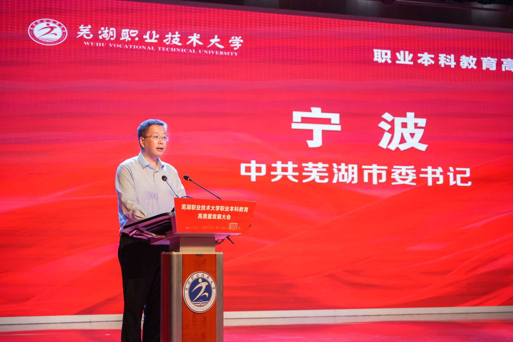 宁波代表市委、市政府向学校全体师生表示热烈祝贺。他指出,芜湖职业技术大学的成功升格,标志着芜湖现代职业教育体系建设迈上新台阶。希望学校强化政治建设,着力培养德技并修的高层次技术技能人才;勇立时代潮头,着力打造一批国内领先、特色鲜明的品牌专业,形成特色发展优势;勇担历史使命,推动更多科技创新成果在安徽和芜湖转化落地,培养更多高技能人才,为芜湖建设省域副中心、为全省打造“三地一区”提供有力人才支撑。宁波表示,市委市政府将全力支持学校早日建成国内一流的职业技术大学。