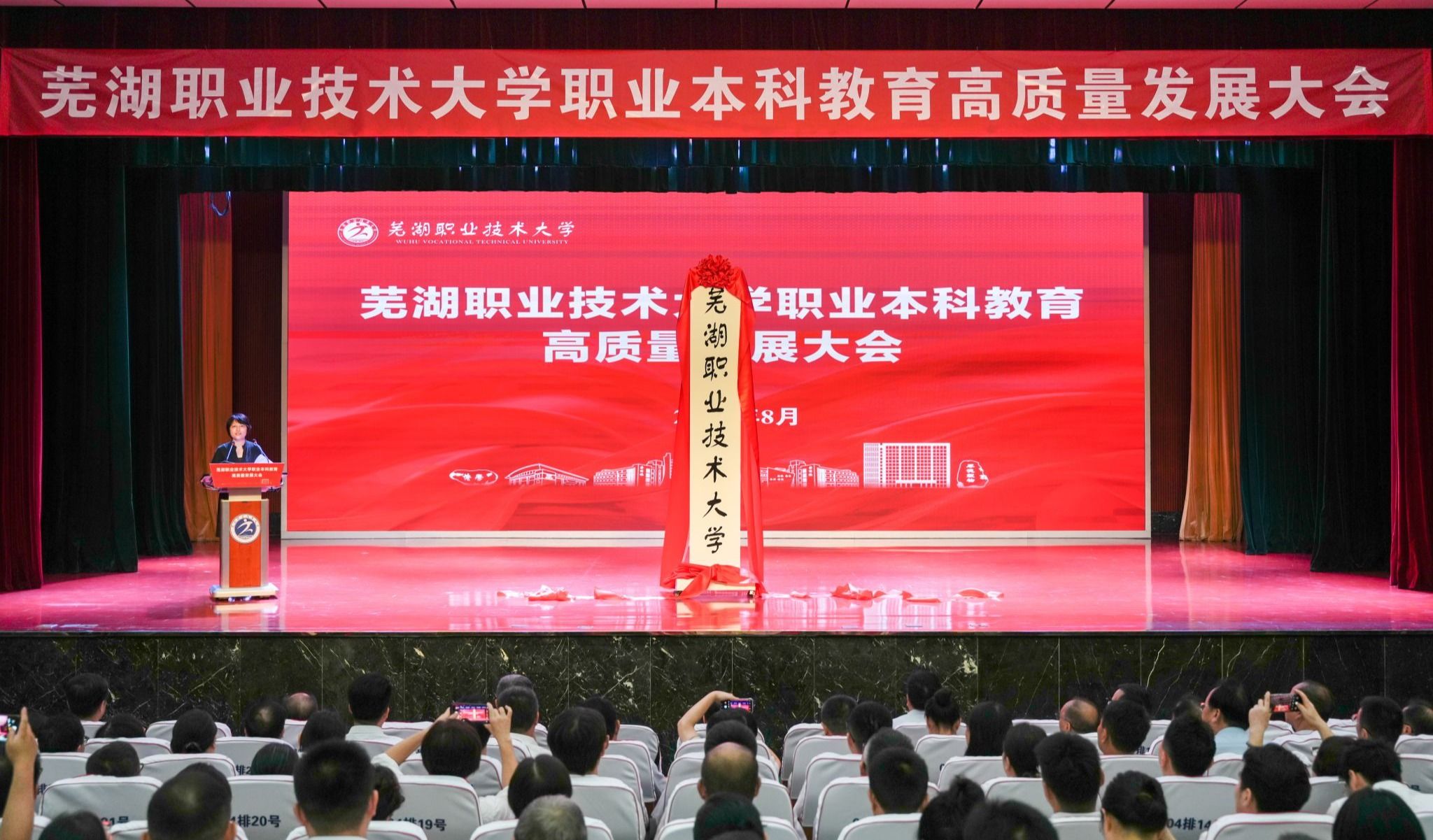 随着鲜艳的红绸布缓缓落下,镌刻着“芜湖职业技术大学”校名的牌匾正式亮相,在全校师生代表见证下,芜湖职业技术大学正式挂牌成立。