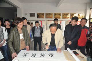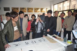 图为老领导在电气系实训中心挥毫