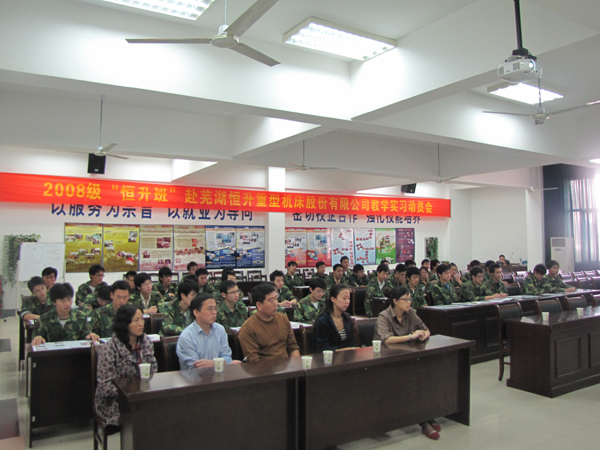 本次2008级“恒升班”学生的教学实习工作得到了校企双方领导的高度重视,成立了以校企双方主要领导为组长的教学实习领导小组,详细制定了《芜湖职业技术学院2008级“恒升班”赴芜湖恒升重型机床股份有限公司教学实习安排计划》。实习前,校企双方召开了教学实习工作协调会,具体部署了此次教学实习工作。10月10日校企双方共同召开了教学实习动员会,恒升公司桂德华副总经理率综合管理部、人事办公室一行四人,学院校企合作办公室、机械工程系相关领导出席了实习动员会。机械工程系教师代表以及2008级“恒升班”全体同学参加了教学实习动员会。此次实习活动中,学院安排了指导教师与实习学生同吃同住,在驻点进行有重点有目标的现场教学和管理工作,恒升公司的总装车间、大件车间、中小件车间分别为每个实习学生安排好了技术过硬的实习指导教师,以师带徒的方式进行实习。