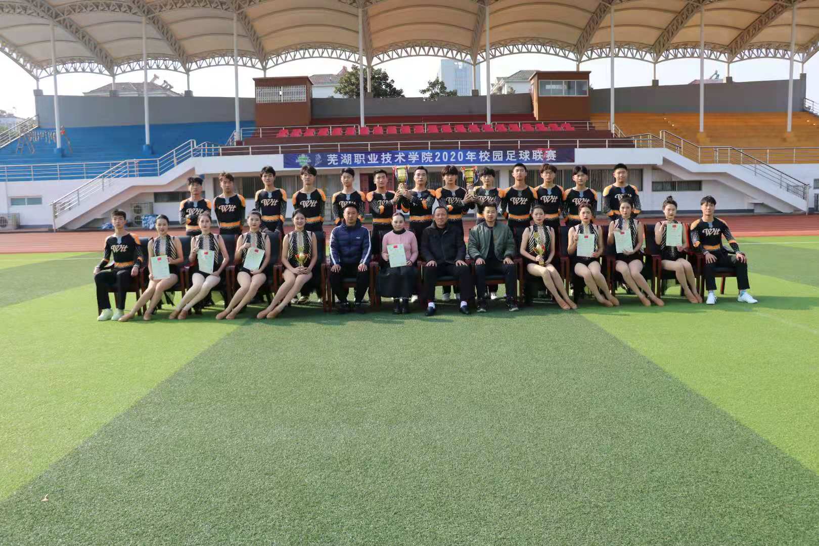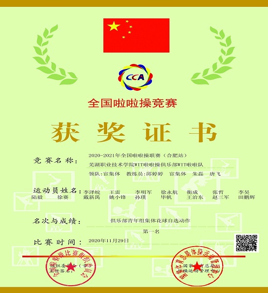 11月28-29日,2020-2021年全国啦啦操联赛(合肥站)在合肥职业技术学院体育馆隆重举行,来自全省各地市的114支代表队共计2500余人参赛。我校啦啦操俱乐部男子16人、女子8人参加了公开青年组(本专科不分)、俱乐部青年组(高职高专组)四个集体项目的角逐,通过两天线上、线下激烈的比拼,我校啦啦操俱乐部分别获得俱乐部青年组集体花球自选动作(男生)第一名,俱乐部青年组集体爵士自选动作(女生)第一名;公开青年组集体花球自选动作(男生)第四名,公开青年组集体爵士自选动作(女生)第二名。
