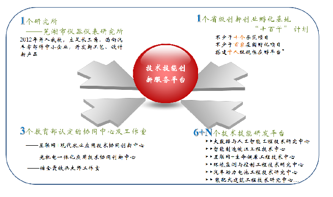 建立“行业主导、政府引导、学校牵头、企业参与”的四方协同联动机制,着力打造多方融合、机制灵活、资源共享、集聚一体的1136+N科技创新服务平台。2020年新建“智能制造皖江工程技术研究中心”“生命健康工程技术研究中心”“大数据与人工智能工程技术研究中心”“环境监测与控制工程技术研究中心”“现代汽车与航空工程技术研究中心”“装配式工程技术研究中心”等6个工程技术研究中心,其中5个被认定为芜湖市市级工程技术研究中心;加强科技创新团队培育,注重科技成果转化。培育“生态环境监测智能化科技创新团队”“食源性细菌诊断和防控研究团队”“新能源储能材料技术创新团队”“无人驾驶技术科技创新团队”等4个科技创新团队和“协推合创一体化科技服务团队”“长三角乡村振兴科技扶贫团队”2个科技服务及科技扶贫团队,积极推动科技创新在服务地方产业转型和经济社会发展中发挥更大作用。截至2020年学校已承接芜湖市科技计划项目19项、省级科研项目123项、横向课题和技术服务700多项,实现授权专利307件、发明专利70件,进入安徽省发明专利百强排行榜,位居全省高职第一位;积极推动成果转化,2020年完成34项发明专利转化到企业生产一线,打造“互联网+现代农业应用技术协同创新中心”“光机电一体化应用技术协同创新中心”“储金霞铁画大师工作室”“安徽省AA级创业孵化基地”“安徽省芜湖仪器仪表两仪所”5个省部级科研平台,累计预算1330万元。与地方企业联合起草地方标准《翡翠烧卖制作工艺规程》和《“双低”油菜生产技术规程》。针对产教融合创新平台、校企合作实训基地建设,起草《高职院校技术技能创新服务平台建设要求》和《高等职业院校校企合作实训基地建设规范》两项地方标准。