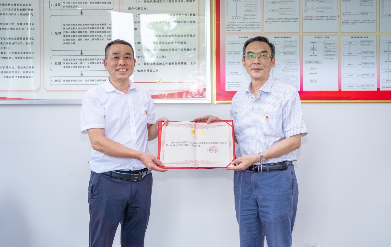 校党委副书记吴长湖为花桥村党总支第一书记袁祖发颁发思政课校外实践教学指导教师聘书。