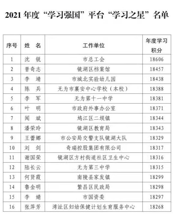 近日,中共芜湖市委宣传部、市委讲师团在全市开展 2021 年度“学习强国”平台“先进学习党组织”和“学习之星”评选活动,我校机关党委及三名党员榜上有名,获芜湖市委宣传部、市委讲师团通报表彰。