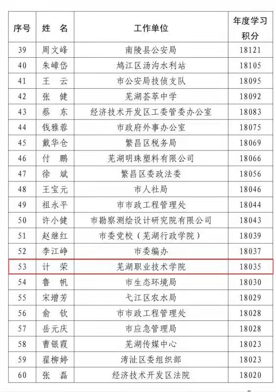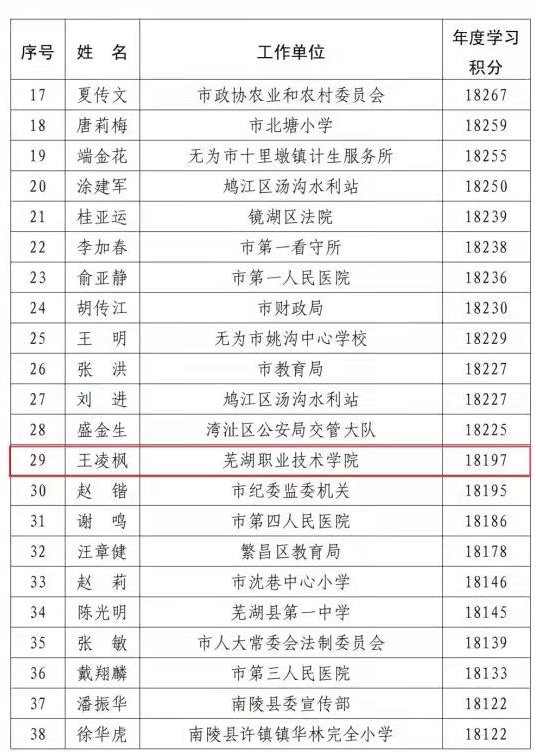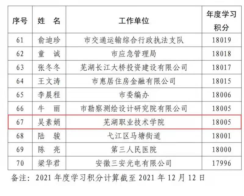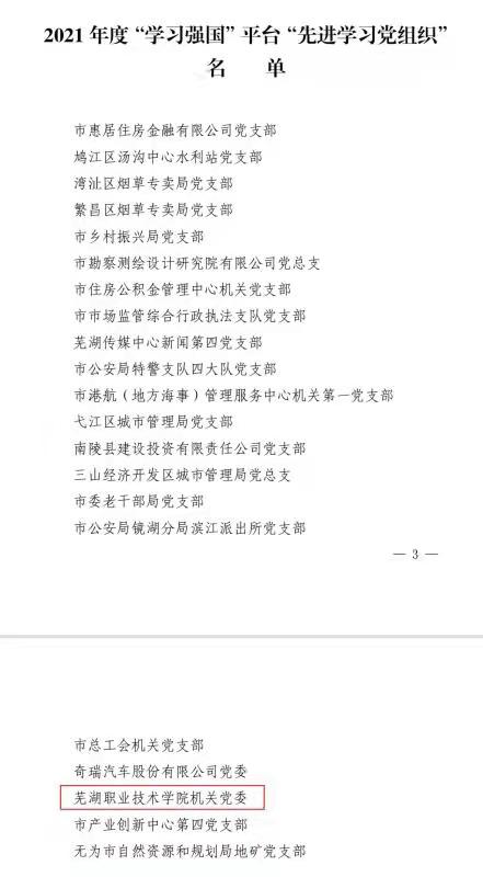 本次评选中,机关党委荣获芜湖市2021年度“学习强国”平台“先进学习党组织”称号;教务处王凌枫、经济管理学院计荣、马克思主义学院吴素娟等三名党员荣获全市“学习之星”称号。