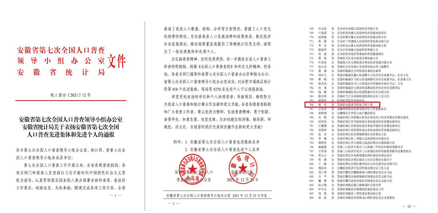 近日,芜湖市人口普查办公室、芜湖市统计局联合对在第七次全国人口普查工作中,涌现出来的先进集体进行通报表扬,我校获得芜湖市“第七次全国人口普查先进集体”荣誉称号。学校人口普查领导小组办公室联络员、保卫处消防技防科科长顾玮同志获得安徽省“第七次全国人口普查先进个人”称号。