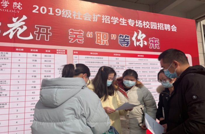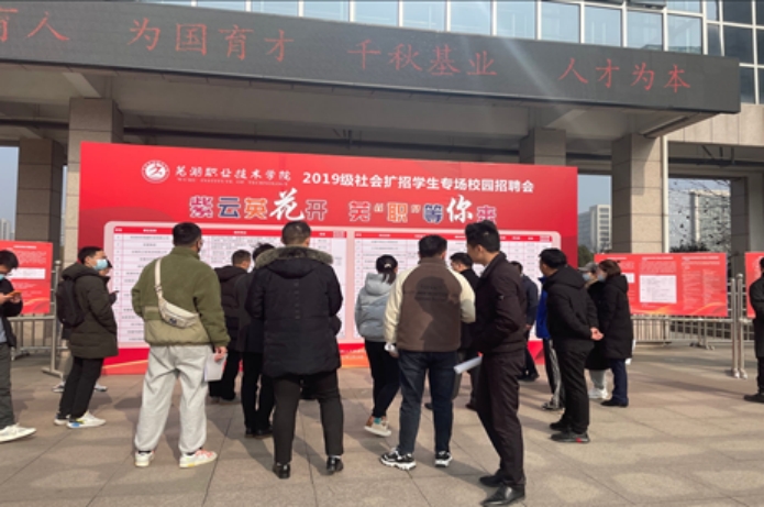 为了促进社会扩招学生更加充分更高质量就业,1月16日,我校与芜湖人力资源和社会保障局、芜湖人才发展集团联合举办的“紫云英花开 芜湖等你来”2019级社会扩招学生专场校园招聘会在南校区教学楼广场如期举行,我校600余名2019级社会扩招学生参与,学校招生就业处全体人员、二级学院书记、辅导员在现场做好就业指导和职位推荐服务。