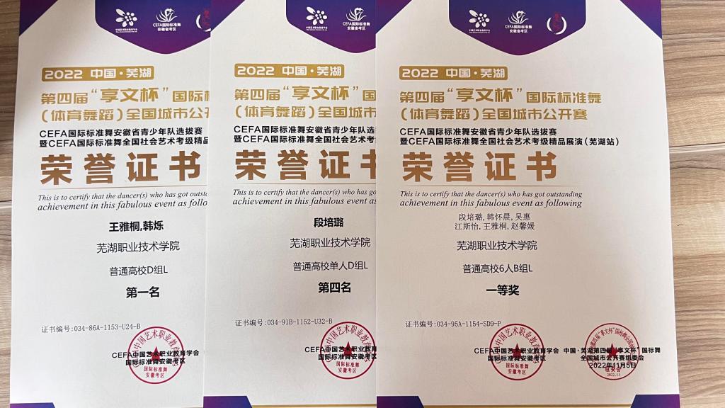 11月5日,由中国艺术职业教育学会国际标准舞专业委员会、芜湖市体育局、芜湖市文化和旅游局主办,安徽享文文化传播有限公司承办的“第四届享文杯国际标准舞(体育舞蹈)全国城市公开赛”在芜湖市奥体中心体育馆举行。我校体育舞蹈代表队在宦集体、朱姗姗老师的带领下,共派出段培璐等7名男女运动员,参加了高校组三个项目的角逐,并取得两项第一的优异成绩。