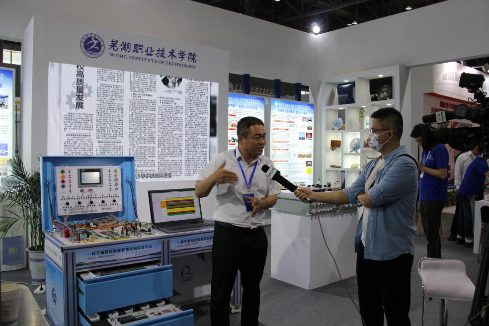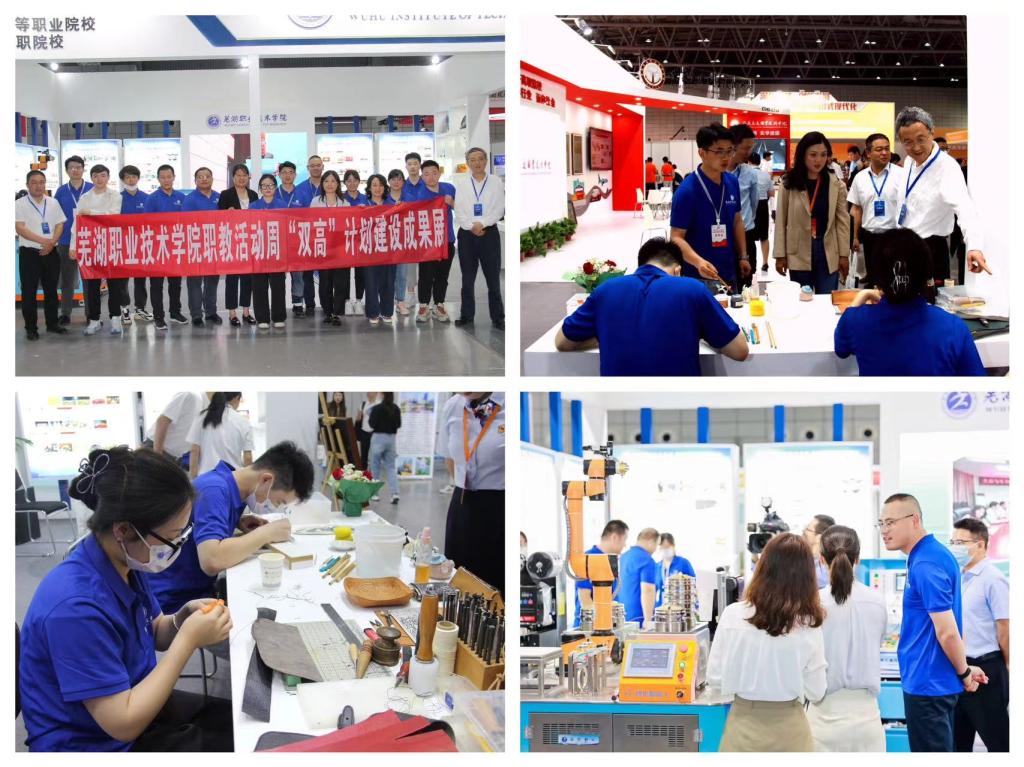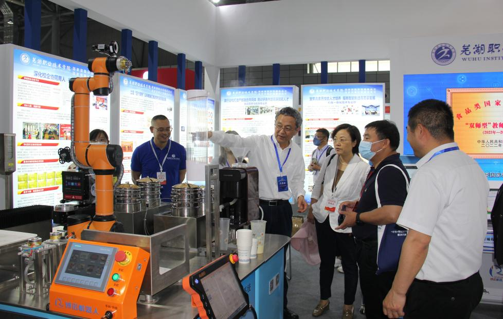 会议同期组织了职业教育科技创新成果与数智实训装备技术展、双高计划建设院校成果展、安徽省职业教育建设成果展。我校以“技能改变生活”为主题,全面展示了学校“双高”计划建设成果。电气与自动化学院展示了校企联合设计开发的智能协作机器人制餐服务系统与PLC智能控制实训系统;食品与生物工程学院展示了地方特色传统小吃,介绍了专业在传承非遗文化、打造地方标准方面的经验做法;艺术传媒学院两名学生分别在现场进行陶瓷绘画、皮艺制作非遗工艺展示。在展位现场,校领导亲自站台宣传,我校展位备受关注。(文/李天一 丁美玲 图/侯德华 审/娄洁)