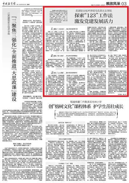 芜湖职业技术学院马克思主义学院坚持以习近平新时代中国特色社会主义思想为指导,深入学习贯彻党的二十大精神,聚焦“一条主线”、建强“两个阵地”、用好“三大课堂”,探索“123”工作法,不断激发党建发展新活力。本文系2022年“江淮文化名家”培育工程领军人才项目研究成果。