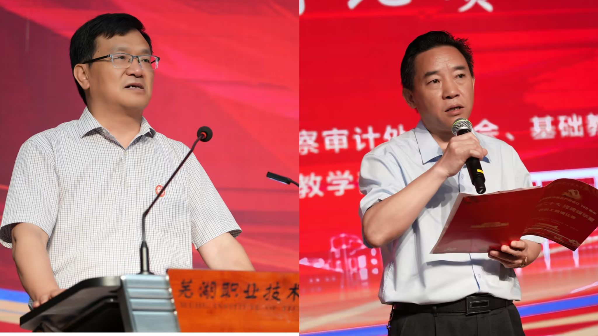 比赛在党委副书记袁家和热情洋溢的致辞中,徐徐拉开帷幕。比赛作品紧扣爱党、爱国、爱校主题,将党的百年奋斗史娓娓道来,歌颂了国家的繁荣富强,述说了无数芜职人坚守理想,不懈奋斗,前赴后继地创造芜职华章的壮举。各参赛队老师们在音乐声中朗朗诵读,时而婉转深情,时而细雨倾诉,时而慷慨激昂。一篇篇不同题材、不同风格的作品,在老师们绘声绘色的朗诵中散发出无穷韵味。一曲曲优美的旋律,一首首优美的作品,为大家带来了一场精彩纷呈的视听盛宴。参赛老师们展现的饱满的热情、沉稳的台风、精湛的表演、专业的朗诵素养,赢得了台下的阵阵掌声。