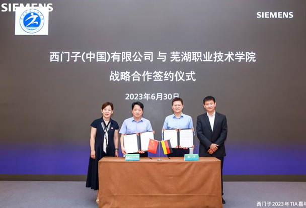 6月30日,西门子2023年TIA嘉年华活动在江城武汉举行,来自海内外企业、政府和高校嘉宾400多人参加此次盛会。会议期间,我校作为高校唯一代表与西门子(中国)有限公司签订共建智能制造创新基地战略合作伙伴协议。该战略合作协议的签署不但加强了西门子(中国)有限公司与我校的紧密联系,而且将有力加速区域性智能制造领域人才储备,助力长三角和芜湖本地区的经济发展。