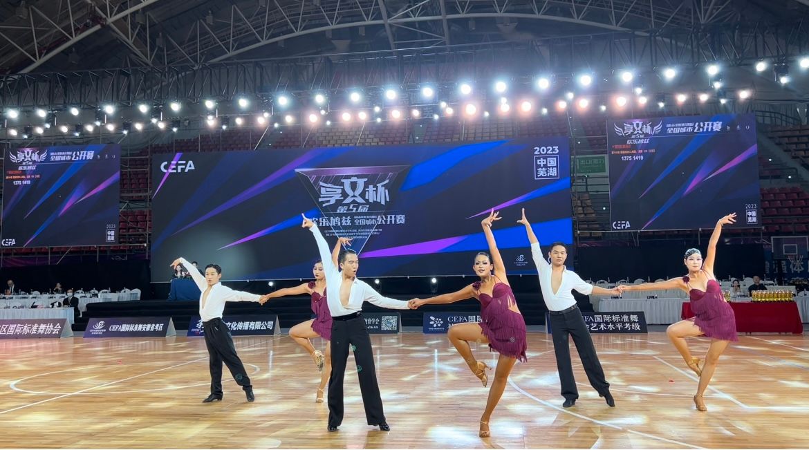 10月4日至5日,由中国艺术职业教育学会国际标准舞专业委员会、芜湖市文化和旅游局、芜湖市体育局共同指导,CEFA国标舞安徽考区主办、安徽享文文化传播有限公司承办的“2023第五届‘享文杯’中国·芜湖国际标准舞(体育舞蹈)全国城市公开赛”在芜湖奥体中心体育馆举办,本届赛事吸引了武汉体育学院、合肥师范学院、安庆师范大学、安徽师范大学、巢湖学院、安徽工程大学等上百支代表队参赛。我校派出由宦集体为领队,朱姗姗为教练员,曹雪娣等6名学生组成的体育舞蹈代表队参加了六个项目的角逐。经过两天激烈比拼,我校体育舞蹈队获得四项第一的优异成绩。