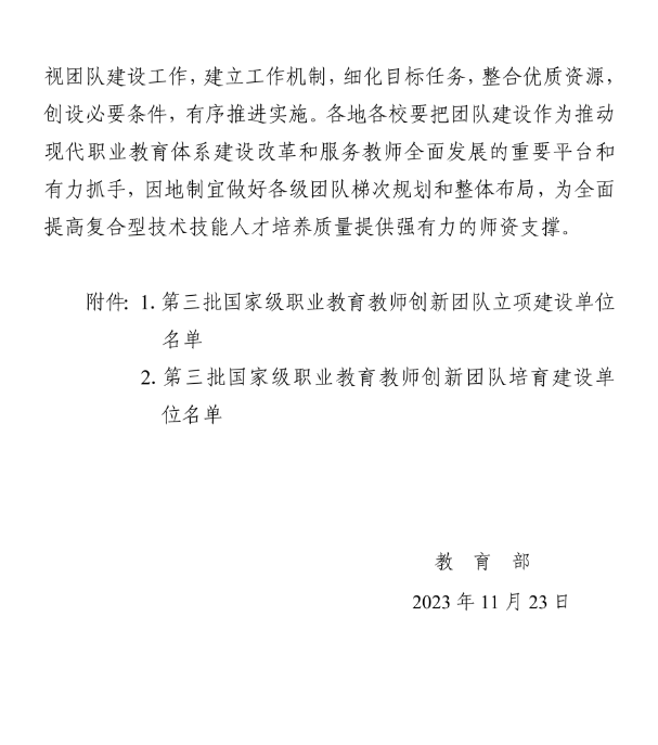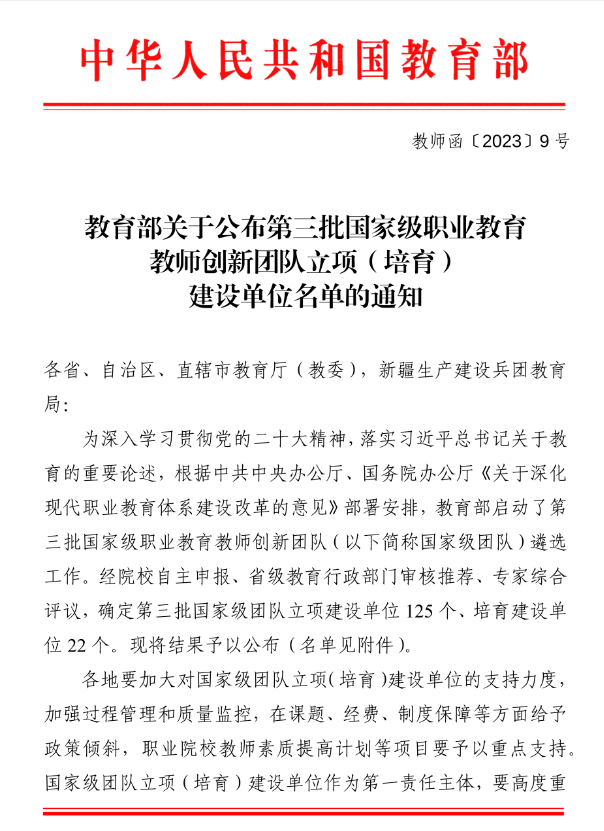 学校将以此次入选为契机,落实立德树人根本任务,巩固和创新教师团队建设模式,充分发挥国家级创新团队立项院校的示范引领和辐射带动作用,打造教师发展共同体,推动教师队伍整体高质量发展,为培养更多高素质技术技能人才、能工巧匠、大国工匠提供强有力的师资支撑,以躬耕教坛、强国有我的奋进姿态,在新时代新征程上广育桃李,再立新功。(文、图/尚晨夕 审/朱蕾)