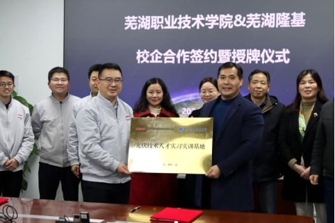 近日,学校携手芜湖隆基光伏科技有限公司举行“校企合作”签约暨授牌仪式,进一步深化产教融合、校企合作,推动与科技领军企业协同育人。党委委员、副院长朱志国率校企合作处、招生就业处及相关二级学院负责人参加签约仪式。经开区管委会党工委副主任朱翠萍、经开区人才交流中心主任季凌洁、芜湖隆基光伏科技有限公司总经理邓升祥,人力资源部经理黄亮等出席仪式。