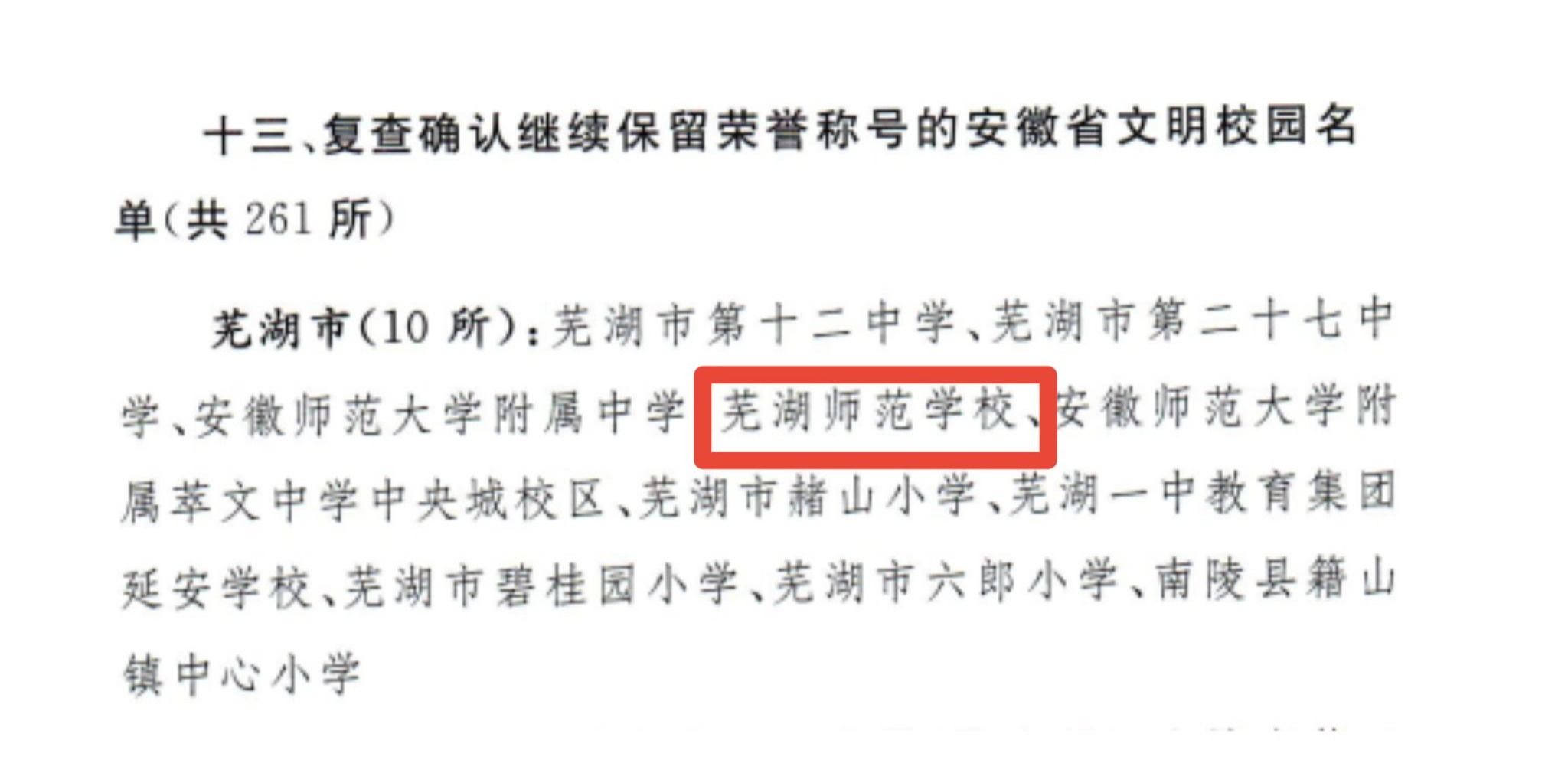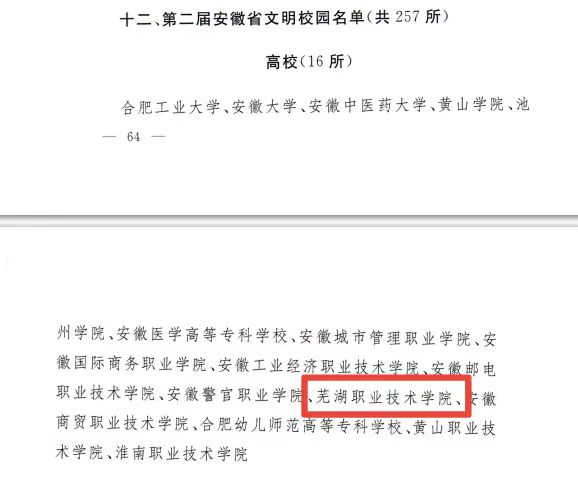 近日,中共安徽省委宣传思想工作和意识形态工作领导小组通报表彰安徽省文明城市(城区)、文明村镇、文明单位、家庭、文明校园单位,芜湖职业技术学院荣获第二届“安徽省文明校园”,芜湖师范学校经复查继续保留“安徽省文明校园”称号。