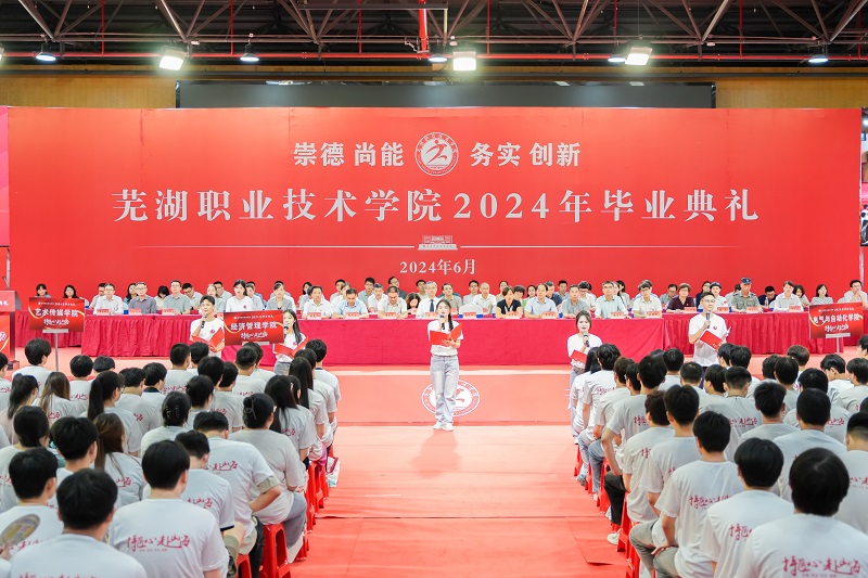 踏歌逐梦行将远,山高海阔再出发。6月29日上午,芜湖职业技术学院2024年毕业典礼在文津校区体育馆举行,7800余名毕业生告别大学生涯,匠心逐梦,奔赴下一场山海。党委副书记、院长高武,党委副书记袁家和,党委委员、副院长季慕寅,副院长刘育红,党委委员、副院长朱志国,各学院、各部门负责人,优秀教师代表,杰出校友代表,后勤保安等服务单位代表,各学院辅导员以及2024届毕业生共同见证这一难忘时刻。典礼由袁家和主持。