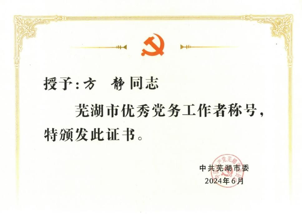 近日,芜湖市庆祝中国共产党成立103周年暨“两优一先”表彰会议召开。我校电气与自动化学院党总支荣获“先进基层党组织”称号,党委组织部副部长方静荣获“优秀党务工作者”称号,马克思主义学院思想道德与法治教研室主任杨翠华荣获“优秀共产党员”称号。