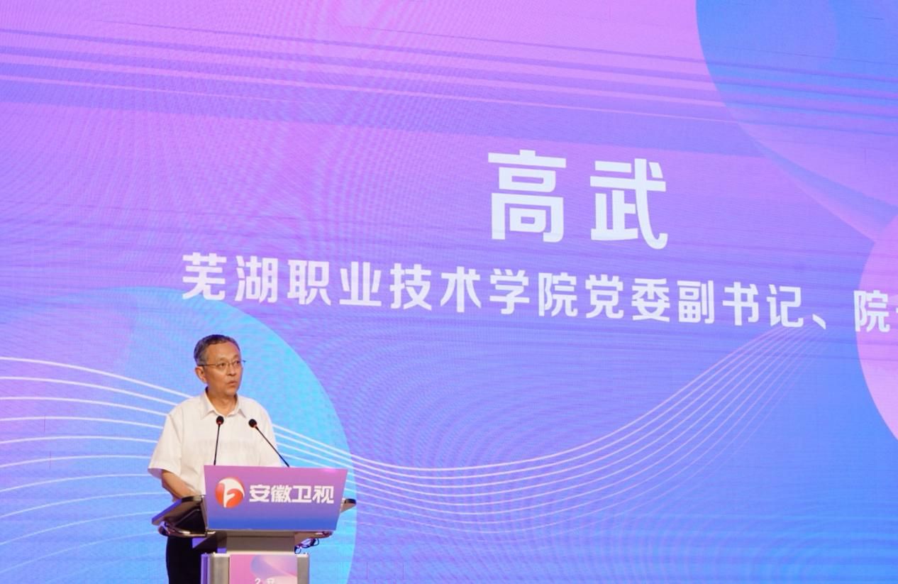芜湖职业技术学院党委副书记、院长高武致辞。芜湖职业技术学院作为职业院校发展改革的排头兵,围绕数字经济的发展,创新电商主播的培养模式,实现播音主持专业和电子商务专业交叉学科融合,实践教学业绩总额破亿元。学校将继续深化教育教学改革,加强与业界的交流合作,为电商直播等数字经济领域培养更多优秀人才。