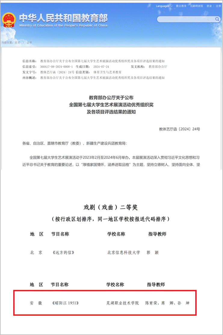 近日,教育部办公厅公布《全国第七届大学生艺术展演活动优秀组织奖及各项目评选结果的通知》,我校美育发展与实践中心创编的戏剧作品《昭阳江1951》荣获艺术表演类戏剧(戏曲)全国二等奖,实现了学校美育工作的新突破。