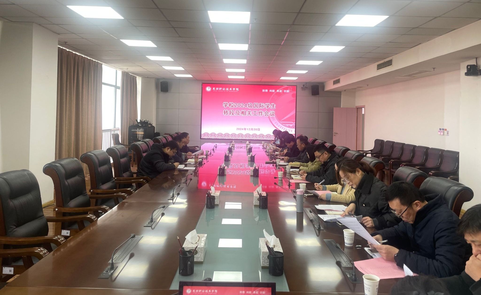 12月20日上午,学校在正德楼1112会议室召开国际学生转段及相关工作会议,确保2024级国际学生转段工作有序稳妥过渡,保障国际学生转段后的各项工作顺利开展,切实提升国际学生的教学和管理水平。党委委员、副院长朱志国出席会议,国际教育管理学院、宣传部、教务处、保卫处、总务处、学生处负责人,智能制造学院、网络工程学院、国际经贸学院、建筑工程学院、信息与人工智能学院负责人和相关教师参加,会议由国际教育管理学院院长谷天祥主持。