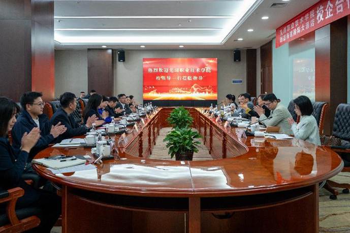 调研座谈会在旌德海螺国际大酒店举行,安徽海创集团股份有限公司酒店板块负责人、旌德海螺国际大酒店董事长王沥主持调研座谈。会上,袁家和向当地政府领导和企业家介绍了学校的发展历程、专业设置以及人才培养等情况,他指出,近年来,学校紧扣国家战略和地方经济发展趋势,聚焦办学能力高水平、产教融合高质量,走出了一条极具特色的发展道路。学校与安徽海创集团已有多年的合作关系,希望进一步拓展与集团旗下更多酒店企业的合作,持续深化校企融合协同育人。他提到,旌德地处皖南国际文化旅游示范区核心区,区位优势明显,发展前景良好。希望通过此次交流,与旌德县政府建立长期稳定的合作关系,推动校地资源共享、优势互补、合作共赢。