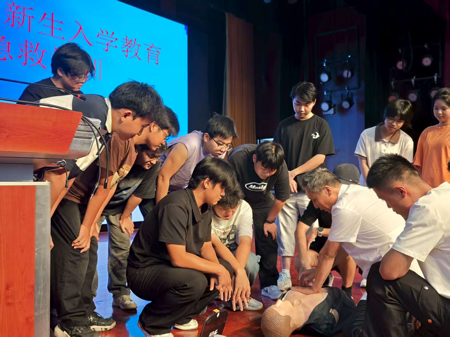 为提升校园应急救护能力,筑牢校园安全防线,贯彻落实急救教育试点学校工作要求,在新生入学教育期间,我校总务处、学生处会同各二级学院对全体新生开展应急救护技能培训。培训共举办21场次,来自市第二人民医院、红十字会、蓝天救援队、南陵县中医医院的专家和校医院老师共同承担培训任务,8500余名新生参加本轮培训。