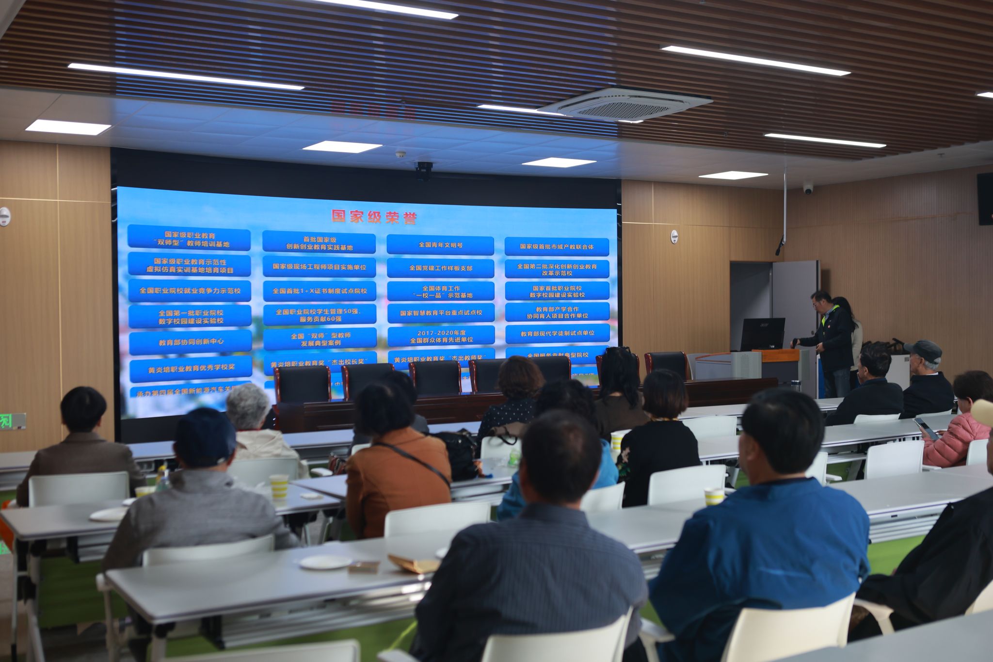 随后,老同志们集中观看了学校职业本科建设宣传片,生动的画面、详实的数据全方位展现了学校近年来在学科建设、师资队伍、实训平台、人才培养、国际交流合作等方面取得的进展。随后,在工作人员的引导下,老同志们兴致勃勃地参观了银湖校区职业本科专业建设情况,近距离感受校园面貌的日新月异与办学实力的稳步提升。大家不时驻足交流,回忆执教岁月的点滴,畅谈学校发展的喜人变化。参观结束后,部分参与活动的老同志们代表在图书馆前合影留念,定格下这个温馨难忘的时刻。