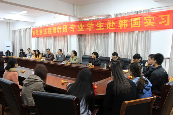 3月21日上午,国际交流合作处和应用外语学院在南校区行政楼302会议室举行欢送会,为2012级应用韩语专业在校生赴韩国首尔研修实习送行。