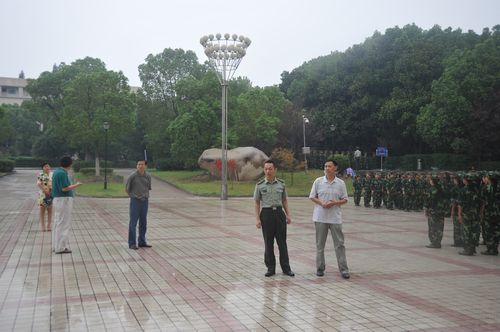 9月23日下午,省教育厅体育卫生艺术教育处副调研员雷著民、省军区学生军训工作办公室参谋张建伟一行冒雨来我院检查新生军训工作。党委副书记袁龙喜及学生处负责人陪同检查。