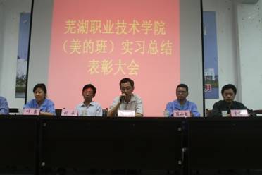 5月20日,芜湖职业技术学院召开了“美的学院”2013年度实习总结表彰大会。学院副院长高武、实训中心主任刘永、美的公司人事运营部部长陈小胜、经理叶霞,电气系领导、美的班班主任、美的班全体学生参加了大会。