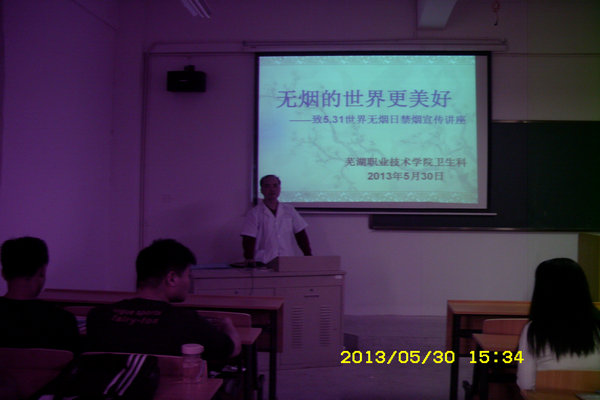 今年5月31日是第25个世界无烟日。为了贯彻国家有关控烟规定,营造芜湖职业技术学院健康、安全、文明的校园环境,强化学生的禁烟知识、态度和行为,促进学生养成良好的文明行为和习惯,卫生科于5月30日下午在学院南北校区同时举办了一次关于“吸烟的危害”为主题的健康教育讲座,来自各系各年级卫生信息员及部分班干到场进行了聆听。