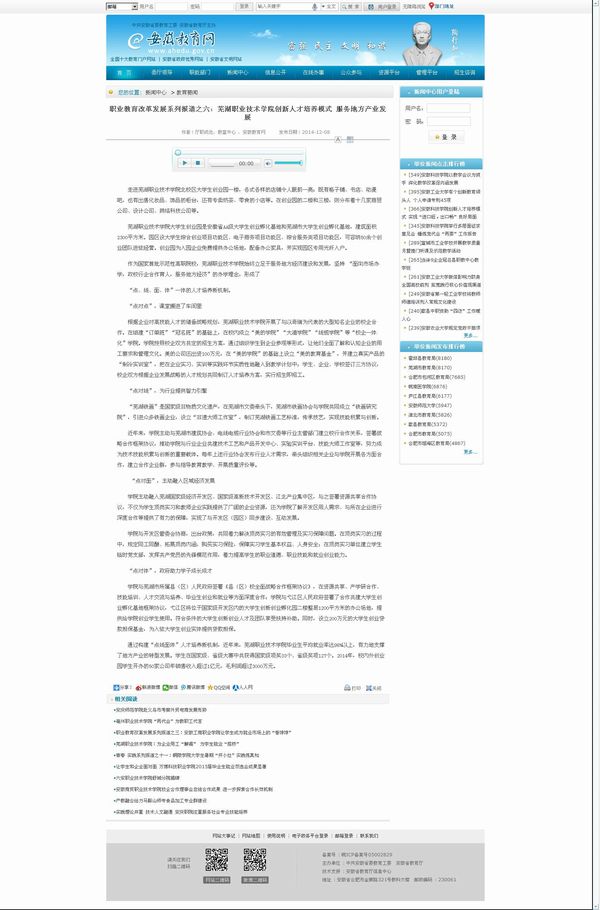 作为国家首批示范性高职院校,芜湖职业技术学院始终立足于服务地方经济建设和发展,坚持 “面向市场办学,政校行企合作育人,服务地方经济”的办学理念,形成了“点、线、面、体”一体的人才培养新机制。