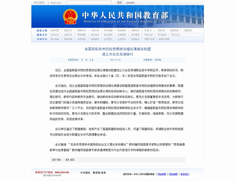 近日,全国高职高专院校思想政治理论课建设联盟成立大会在芜湖职业技术学院召开。教育部社科司、职成司有关负责同志出席会议并讲话。来自全国31个省(区、市)的百余所高职高专院校代表参加了会议。会议指出,成立全国高职高专院校思想政治理论课建设联盟是高职高专院校加强思政课建设的需要。联盟应该建设成为全国高职高专院校思想政治理论课的协同创新中心,做好高职高专院校思政课相关的政策研究、理论研究、教学内容和教学方法研究,推动教材体系向教学体系转化。要充分发挥重要的补充作用,为教育行政主管部门实施分类指导提供咨询、服务和辅助。要充分发挥好平台的作用。精心打造“教师培训、教学交流和教育教学研究”三个平台,切实提升高职高专院校思政课教师的业务水平,增强高职高专院校思政课教学的针对性和实效性。要充分发挥合力的作用,整合联盟各成员院校的力量,打破校级、地域界限,充分发挥联盟网站的作用,实现资源共享。