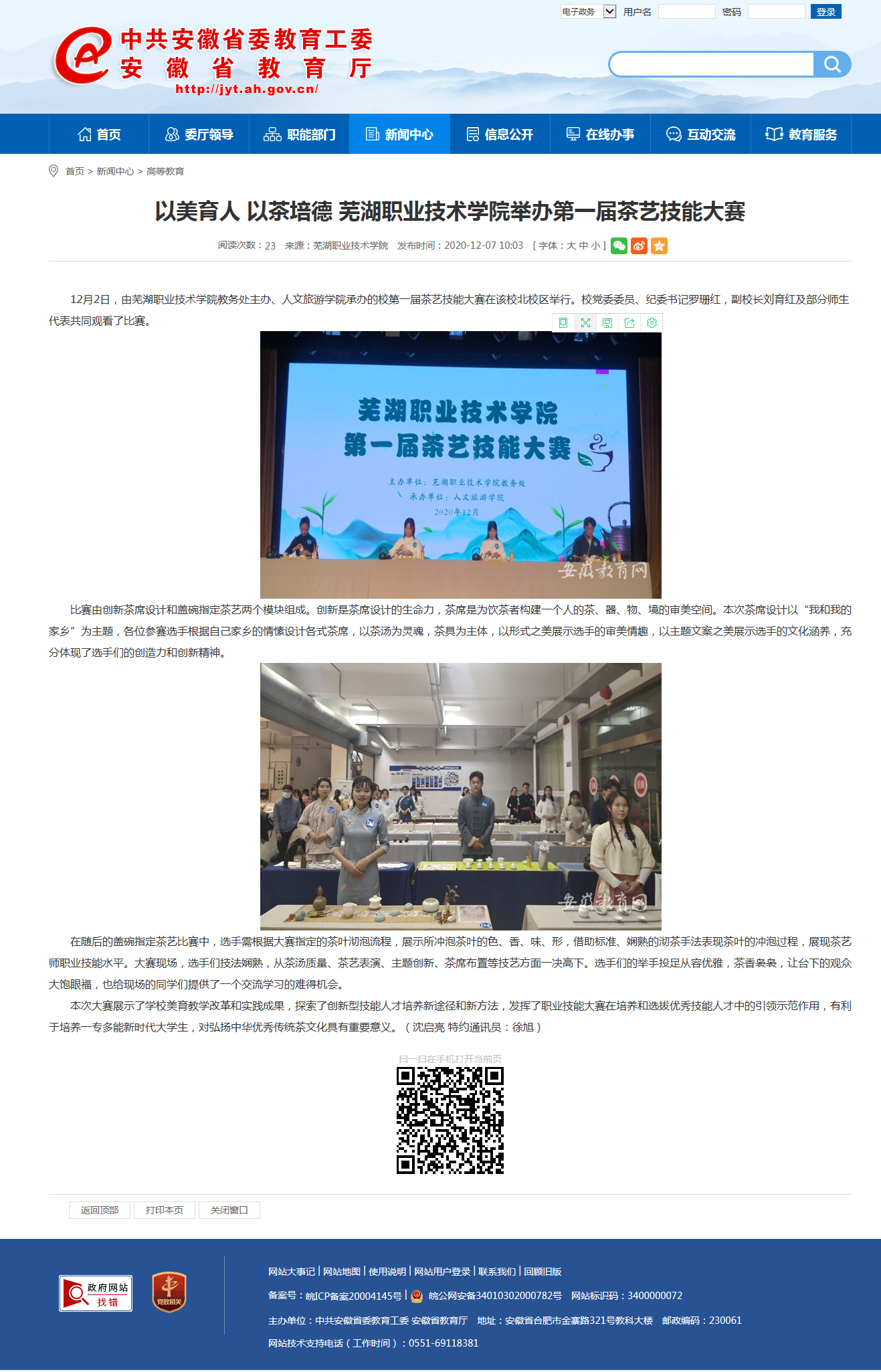 本次大赛展示了学校美育教学改革和实践成果,探索了创新型技能人才培养新途径和新方法,发挥了职业技能大赛在培养和选拔优秀技能人才中的引领示范作用,有利于培养一专多能新时代大学生,对弘扬中华优秀传统茶文化具有重要意义。(沈启亮 特约通讯员:徐旭)