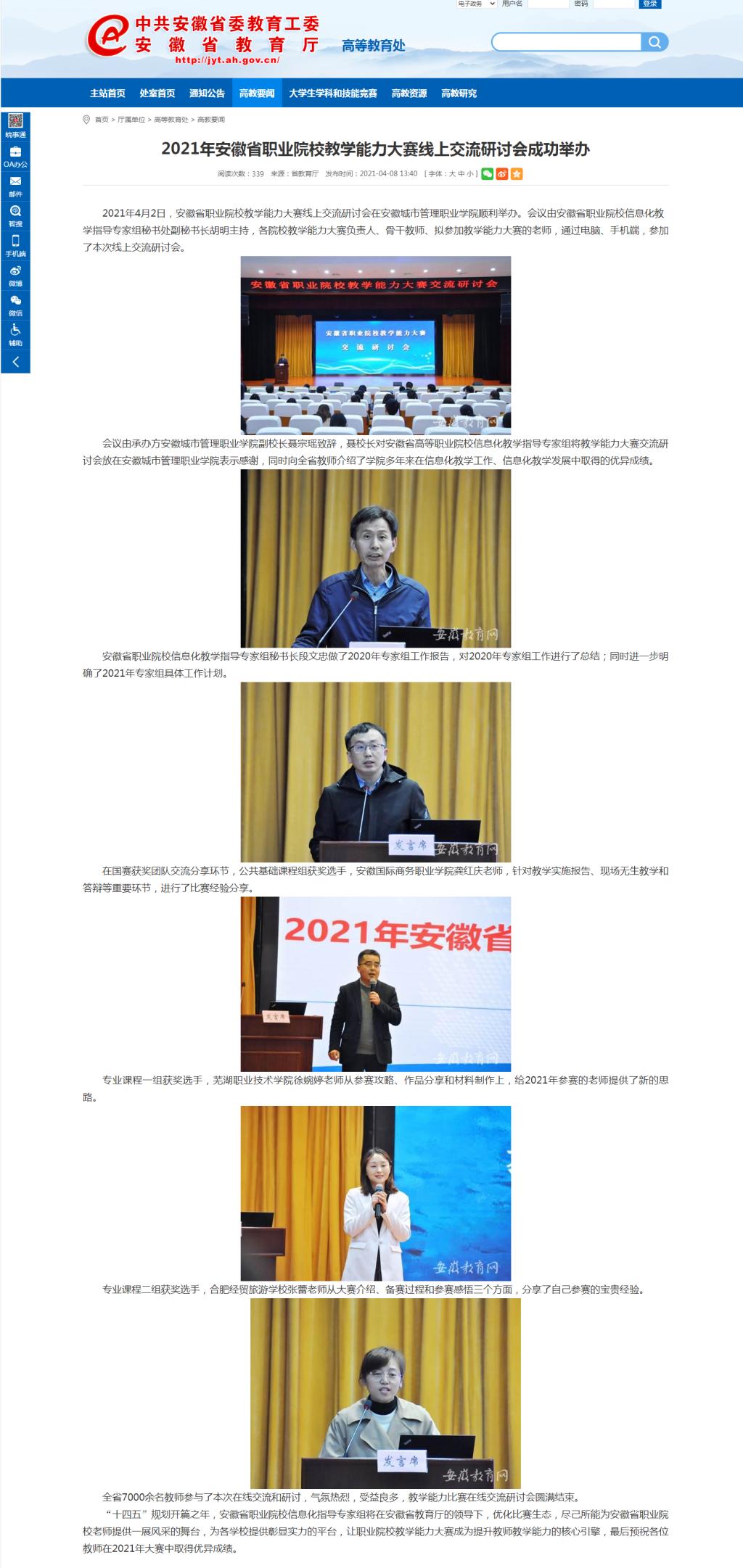 2021年4月2日,安徽省职业院校教学能力大赛线上交流研讨会在安徽城市管理职业学院顺利举办。会议由安徽省职业院校信息化教学指导专家组秘书处副秘书长胡明主持,各院校教学能力大赛负责人、骨干教师、拟参加教学能力大赛的老师,通过电脑、手机端,参加了本次线上交流研讨会。