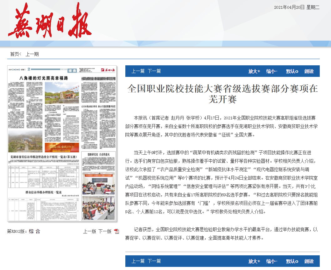 本报讯 4月17日,2021年全国职业院校技能大赛高职组省级选拔赛部分赛项在芜开赛,来自全省数十所高职院校的参赛选手在芜湖职业技术学院、安徽商贸职业技术学院等赛点展开角逐,其中的优胜者将代表安徽省“征战”全国大赛。