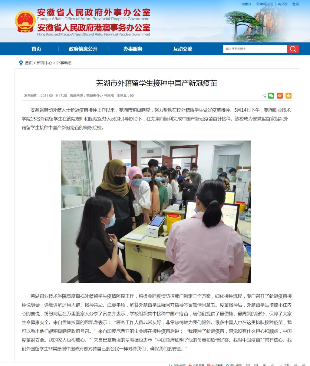 安徽省启动外籍人士新冠疫苗接种工作以来,芜湖市积极响应,努力帮助在校外籍留学生做好疫苗接种。5月14日下午,芜湖职业技术学院15名外籍留学生在该院老师和医院医务人员的引导协助下,在芜湖市顺利完成中国产新冠疫苗首针接种。该校成为安徽省首家组织外籍留学生接种中国产新冠疫苗的高职院校。