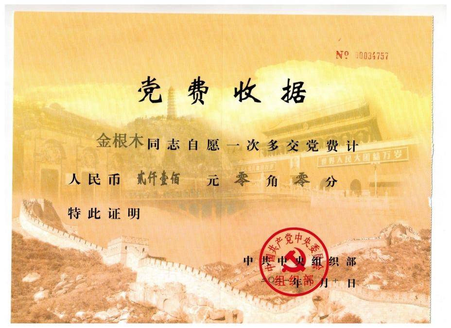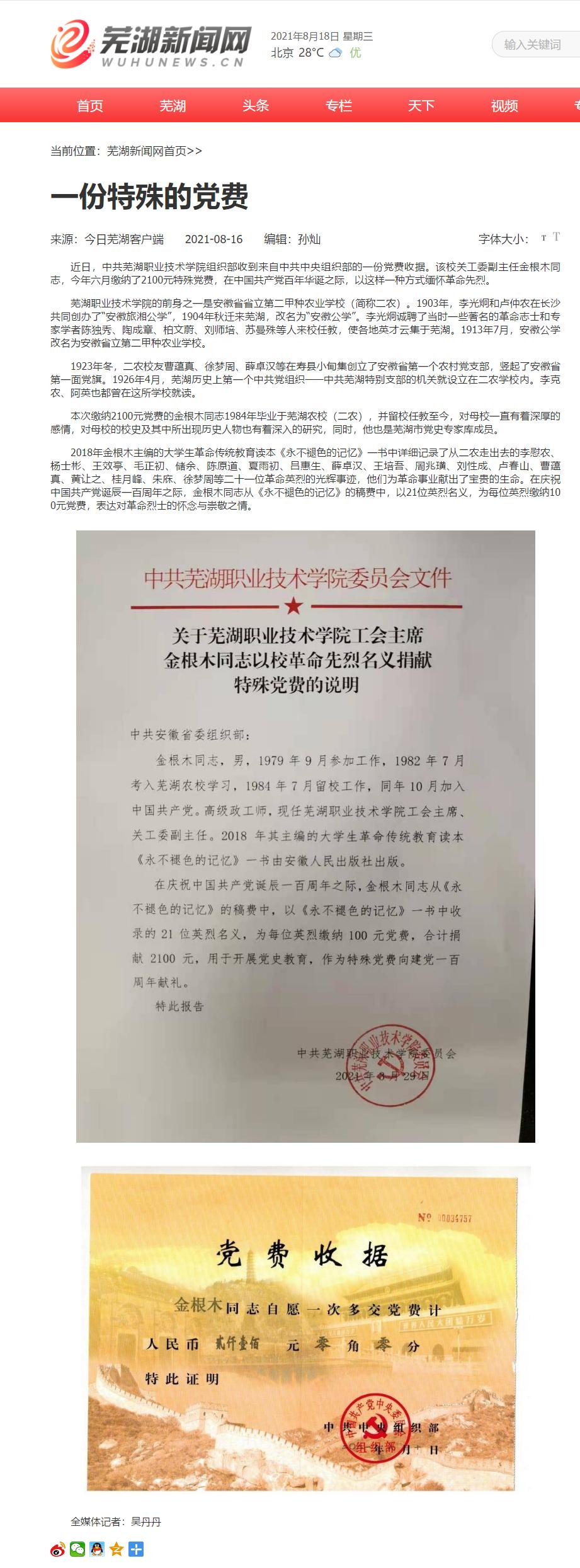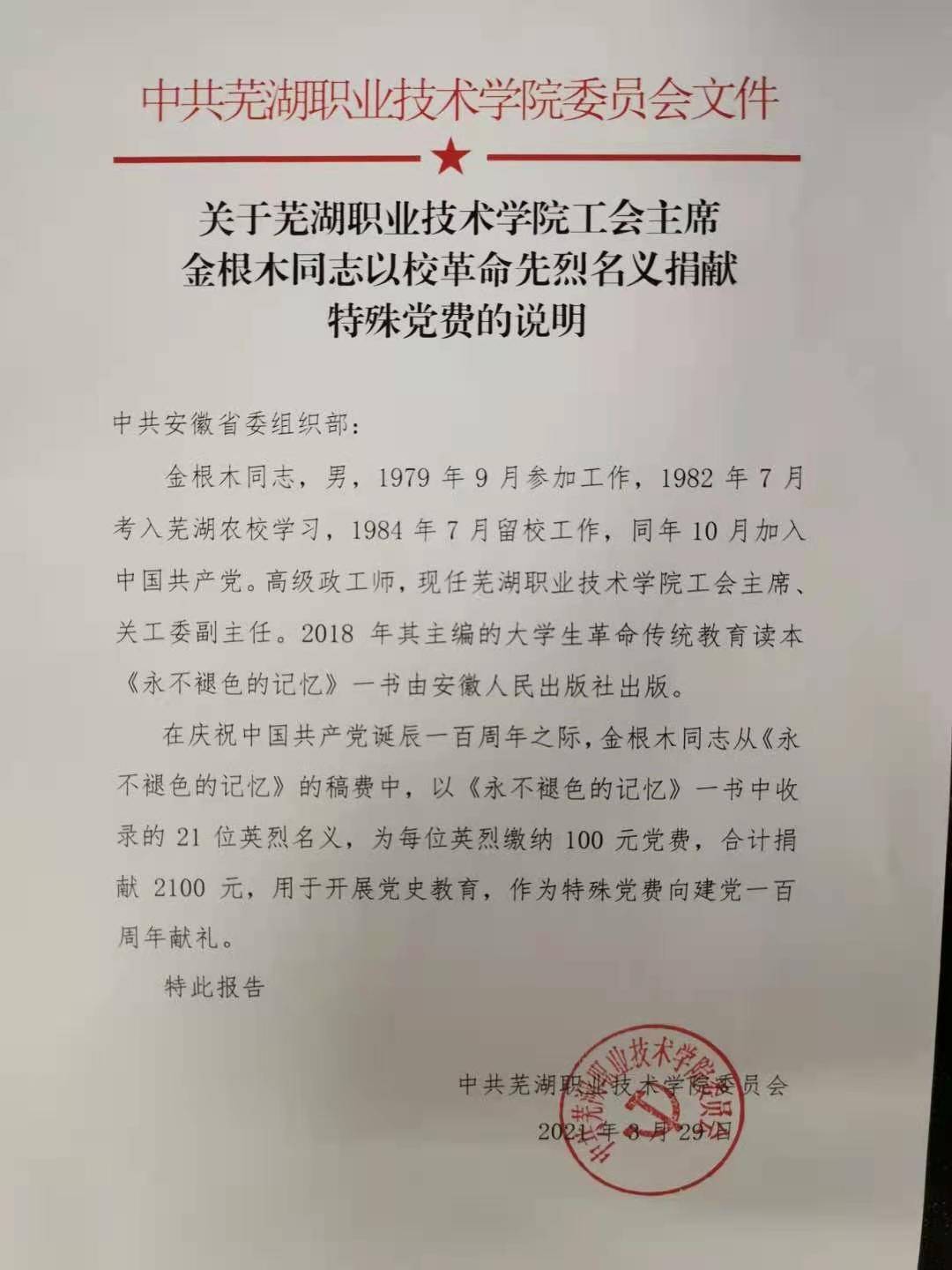 近日,中共芜湖职业技术学院组织部收到来自中共中央组织部的一份党费收据。该校关工委副主任金根木同志,今年六月缴纳了2100元特殊党费,在中国共产党百年华诞之际,以这样一种方式缅怀革命先烈。