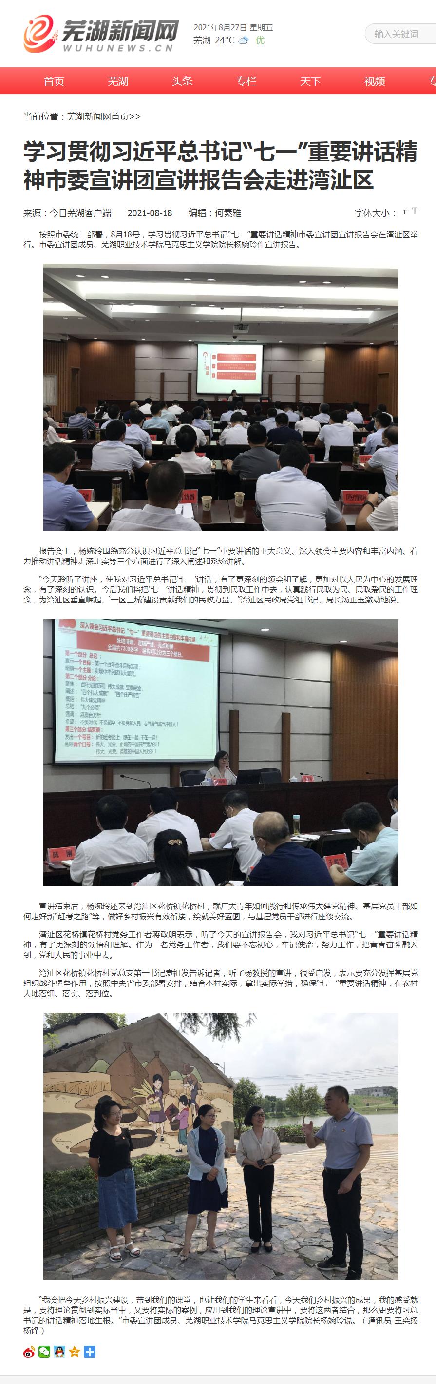 按照市委统一部署,8月18号,学习贯彻习近平总书记“七一”重要讲话精神市委宣讲团宣讲报告会在湾沚区举行。市委宣讲团成员、芜湖职业技术学院马克思主义学院院长杨婉玲作宣讲报告。