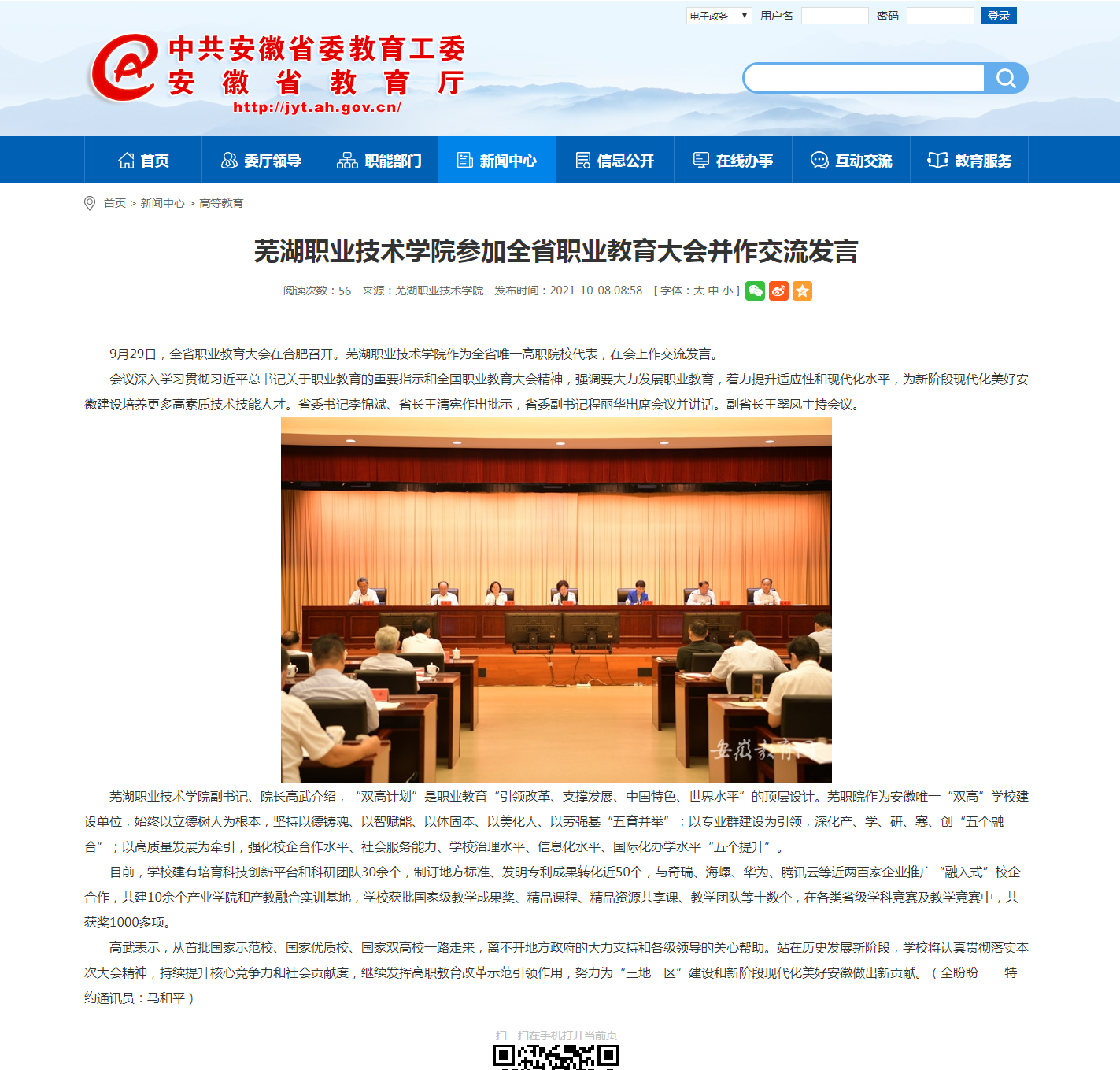 9月29日,全省职业教育大会在合肥召开。芜湖职业技术学院作为全省唯一高职院校代表,在会上作交流发言。