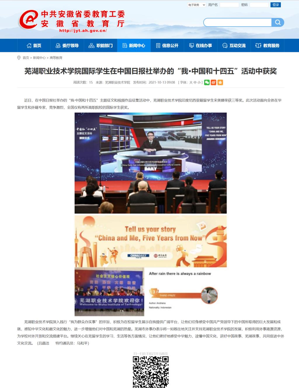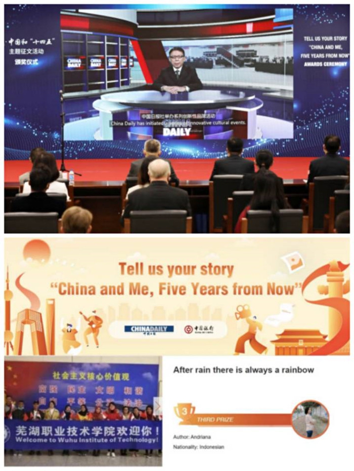 近日,在中国日报社举办的“我·中国和十四五”主题征文和视频作品征集活动中,芜湖职业技术学院印度尼西亚籍留学生宋美娜荣获三等奖。此次活动面向全体在华留学生和外籍专家,竞争激烈,全国仅有两所高职院校的国际学生获奖。