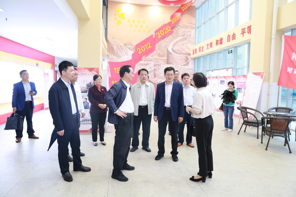 来到学校马克思主义学院基层党建活动中心、“三全育人”实践基地、思政课教学基地,饶有兴趣地观看党的光辉历程及中国梦的主题展示墙,张庆亮表示这种设计非常有创意。参观毛泽东思想和中国特色社会主义理论体系概论情景化教室及思想道德修养与法律基础情景化教室时,张庆亮指出,要把思政教育与技能教育紧密融合起来。看到由郭明义授予该校的“郭明义爱心团队——芜湖职业技术学院分队”旗时,张庆亮肯定其具有很强的思政教育代表性。对于刚刚在湾沚区花桥镇顺利挂牌的芜湖职业技术学院思政课实践教学基地,张庆亮指出,这是把国家乡村振兴战略落到实处,很有职业院校特色。