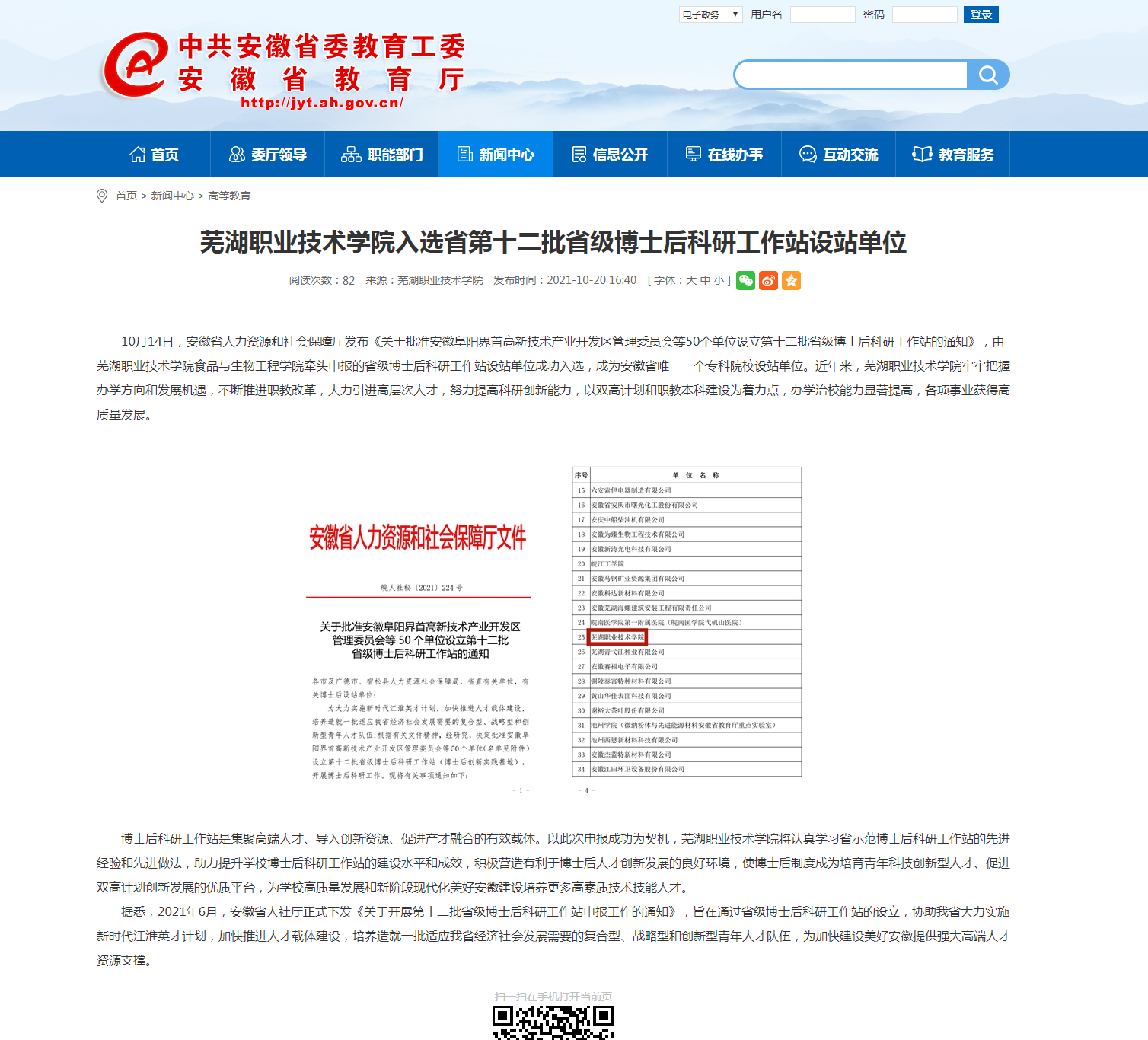 10月14日,安徽省人力资源和社会保障厅发布《关于批准安徽阜阳界首高新技术产业开发区管理委员会等50个单位设立第十二批省级博士后科研工作站的通知》,由芜湖职业技术学院食品与生物工程学院牵头申报的省级博士后科研工作站设站单位成功入选,成为安徽省唯一一个专科院校设站单位。近年来,芜湖职业技术学院牢牢把握办学方向和发展机遇,不断推进职教改革,大力引进高层次人才,努力提高科研创新能力,以双高计划和职教本科建设为着力点,办学治校能力显著提高,各项事业获得高质量发展。
