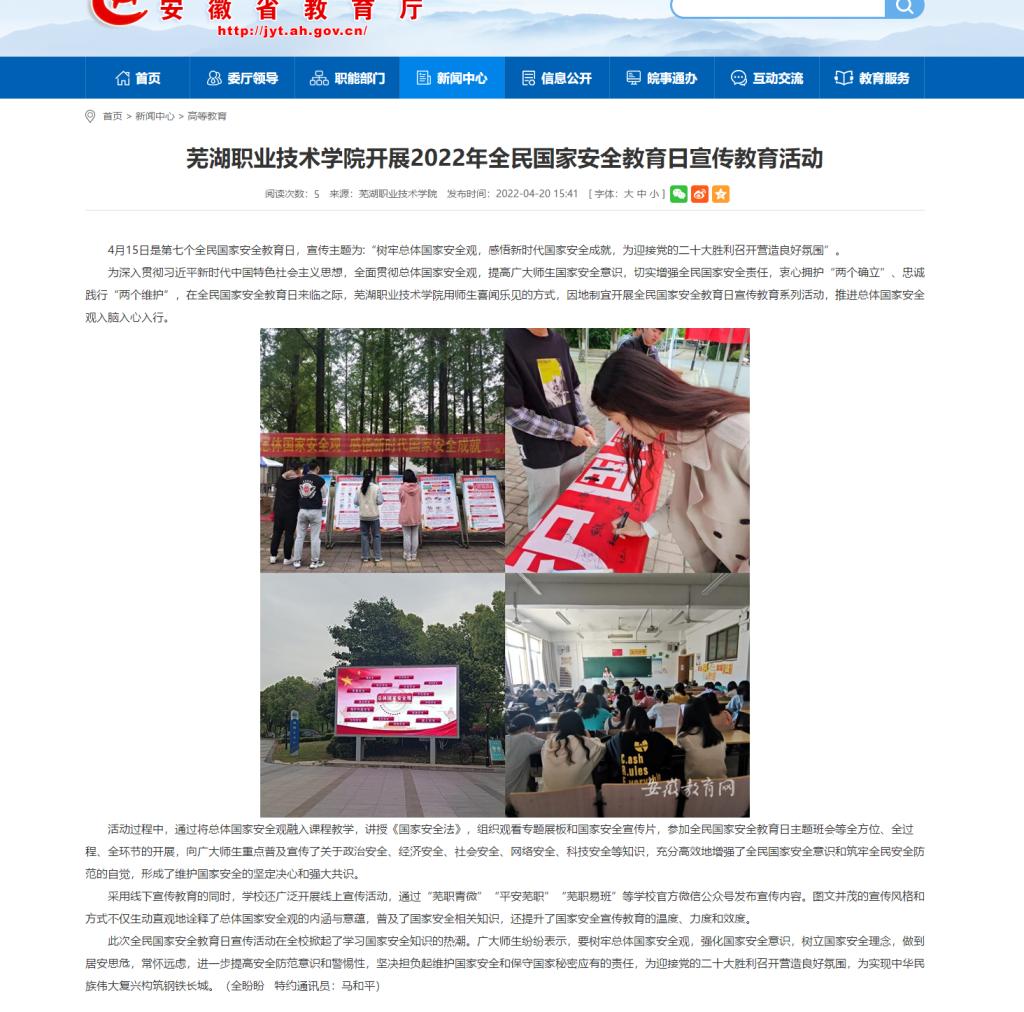 为深入贯彻习近平新时代中国特色社会主义思想,全面贯彻总体国家安全观,提高广大师生国家安全意识,切实增强全民国家安全责任,衷心拥护“两个确立”、忠诚践行“两个维护”,在全民国家安全教育日来临之际,芜湖职业技术学院用师生喜闻乐见的方式,因地制宜开展全民国家安全教育日宣传教育系列活动,推进总体国家安全观入脑入心入行。