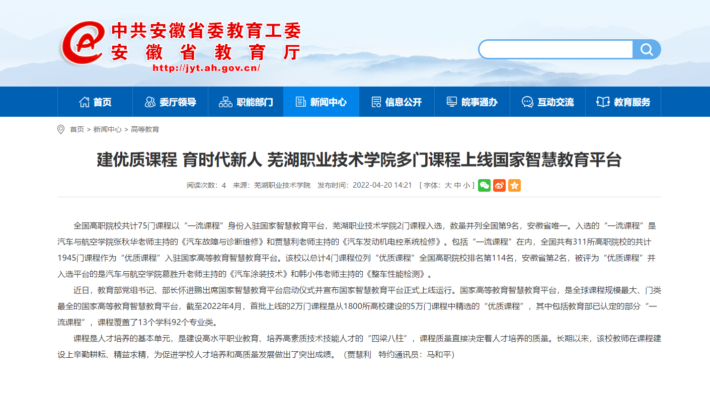 全国高职院校共计75门课程以“一流课程”身份入驻国家智慧教育平台,芜湖职业技术学院2门课程入选,数量并列全国第9名,安徽省唯一。入选的“一流课程”是汽车与航空学院张秋华老师主持的《汽车故障与诊断维修》和贾慧利老师主持的《汽车发动机电控系统检修》。包括“一流课程”在内,全国共有311所高职院校的共计1945门课程作为“优质课程”入驻国家高等教育智慧教育平台。该校以总计4门课程位列“优质课程”全国高职院校排名第114名,安徽省第2名,被评为“优质课程”并入选平台的是汽车与航空学院葛胜升老师主持的《汽车涂装技术》和韩小伟老师主持的《整车性能检测》。