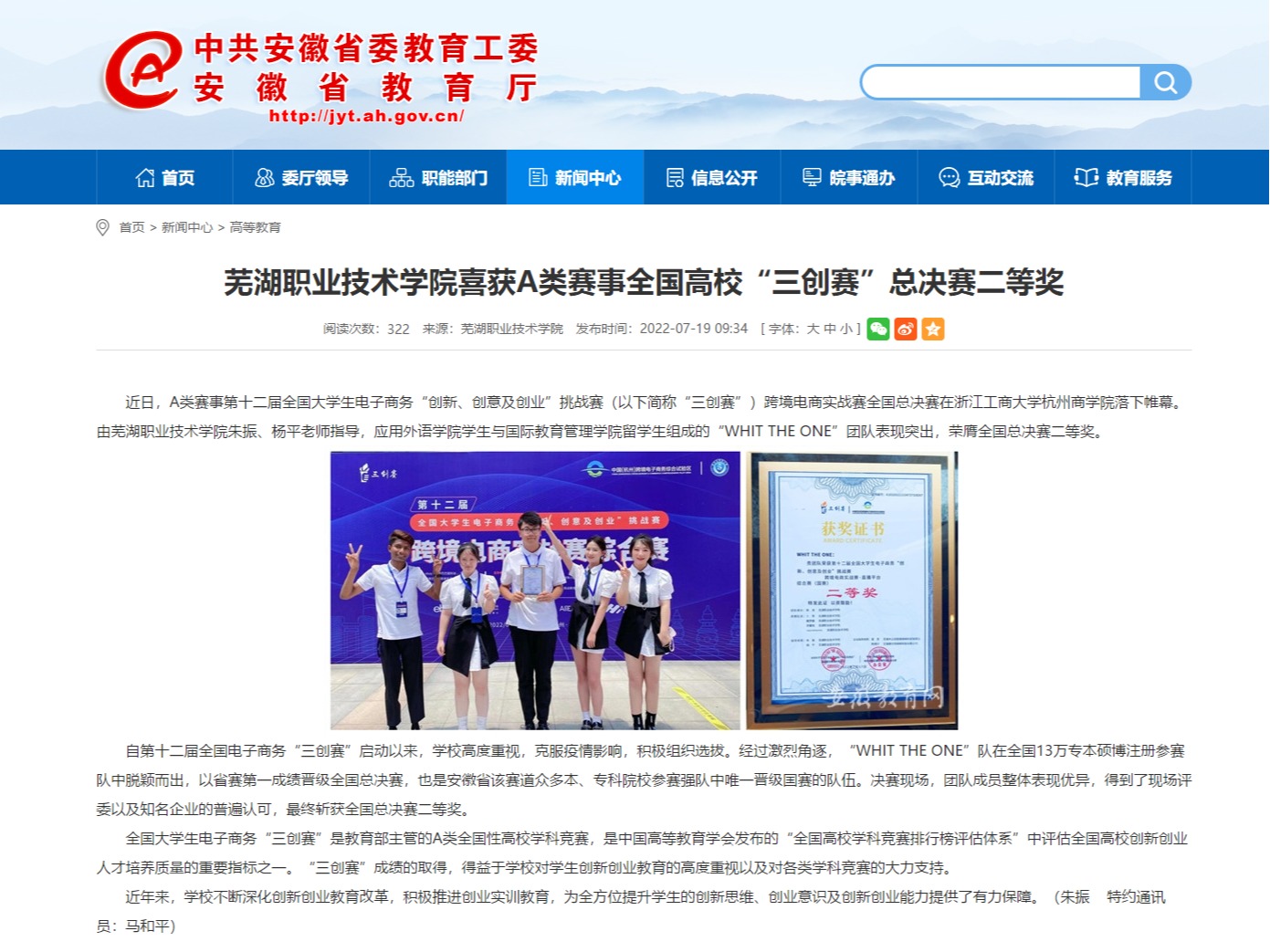 近日,A类赛事第十二届全国大学生电子商务“创新、创意及创业”挑战赛(以下简称“三创赛”)跨境电商实战赛全国总决赛在浙江工商大学杭州商学院落下帷幕。由芜湖职业技术学院朱振、杨平老师指导,应用外语学院学生与国际教育管理学院留学生组成的“WHIT THE ONE”团队表现突出,荣膺全国总决赛二等奖。