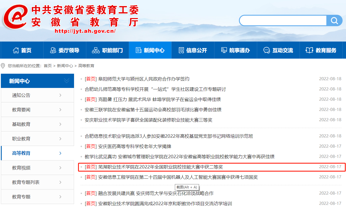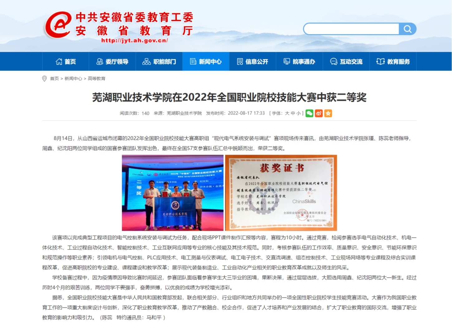 8月14日,从山西省运城市闭幕的2022年全国职业院校技能大赛高职组“现代电气系统安装与调试”赛项现场传来喜讯,由芜湖职业技术学院张瑾、陈蕊老师指导,周鑫、纪沈阳两位同学组成的国赛参赛团队发挥出色,最终在全国57支参赛队伍汇总中脱颖而出,荣获二等奖。